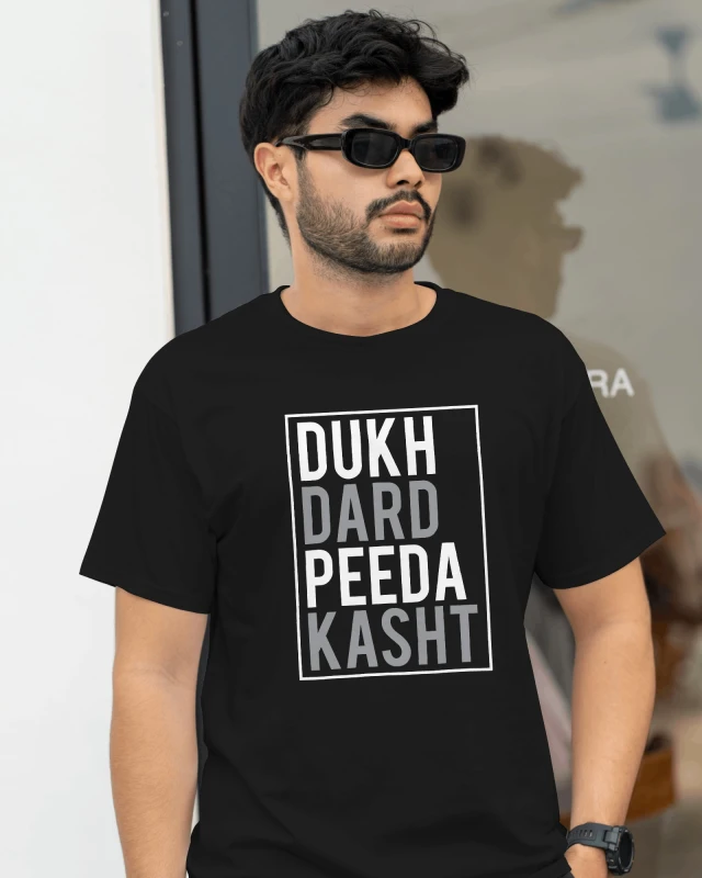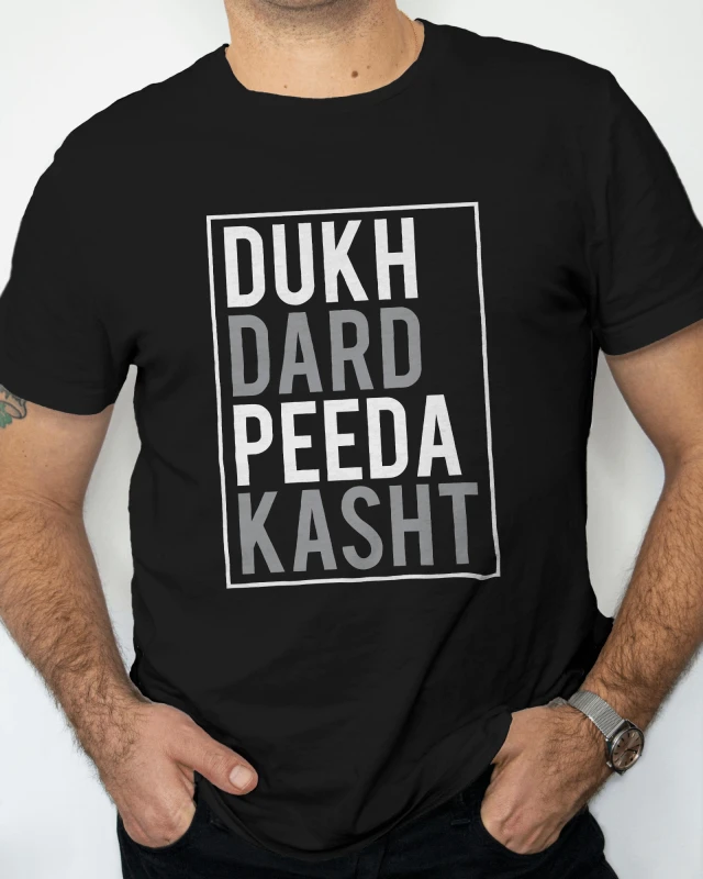 The Dukh Dard Peeda tee features a timeless classic fit that drapes perfectly, offering a relaxed yet put-together look. Its versatile design makes it easy to pair with jeans, shorts, or layer under a jacket, ensuring you can express your unique style effortlessly. More than just a comfortable tee, it's a conversation starter, a symbol of shared human experience that resonates with authenticity. Wear it with pride and connect with a community that celebrates the full spectrum of life's emotions.
